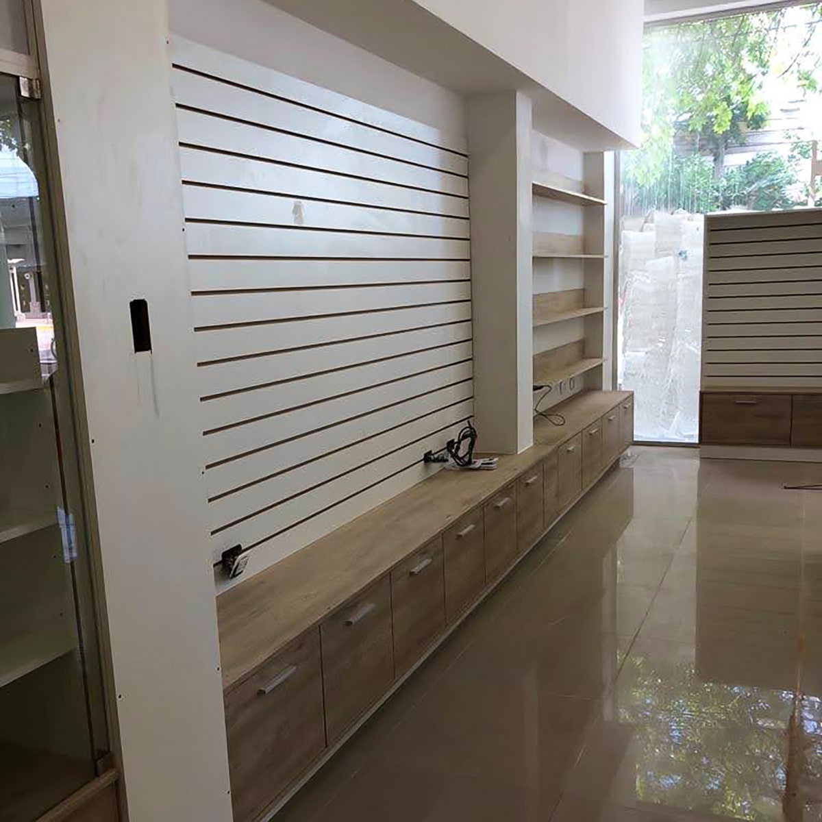 Nuestra gama incluye expositores de alta calidad que permiten una presentación organizada y atractiva de los productos, estanterías de fácil acceso que garantizan la disponibilidad constante y cómoda interacción para los clientes, placas ranuradas para colgado de productos con ganchos como también espacio de guardado en la parte baja para facil y rapida reposición.